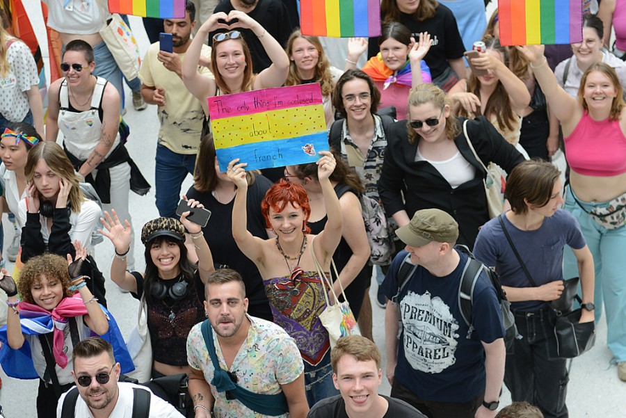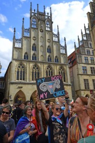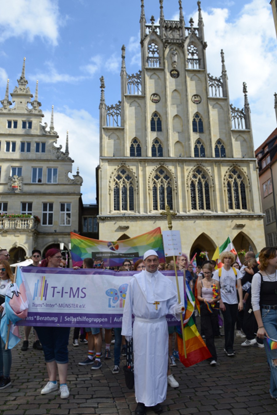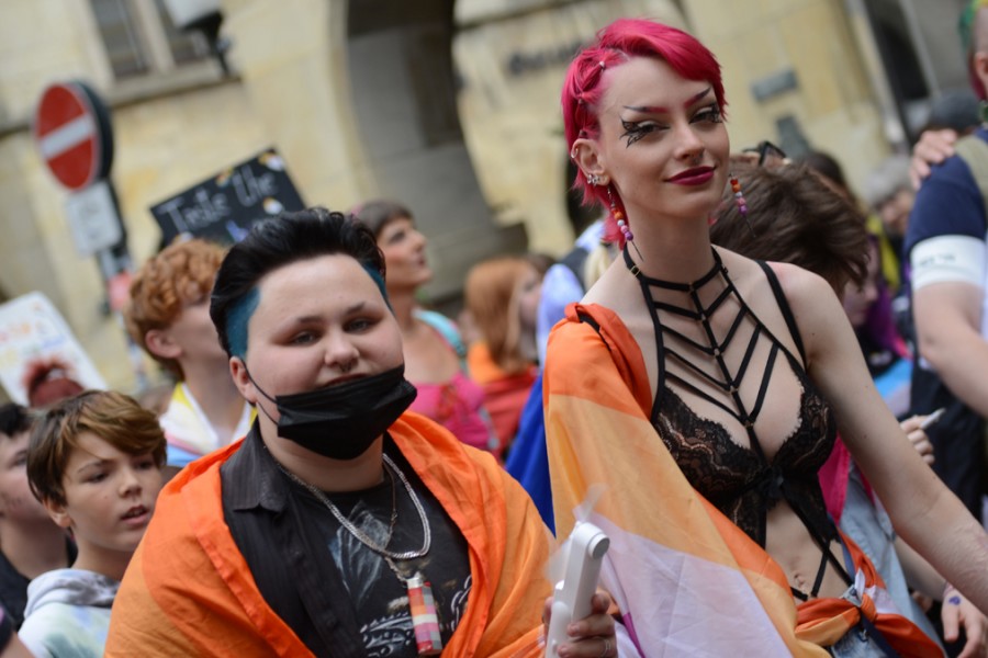 Von weit her angereist, darunter Menschen jeden Alters – wobei die jüngeren Generationen in der Überzahl waren – fanden sich Teilnehmerinnen aus Dortmund, Köln, Wuppertal, Bremen, Hamburg und den Niederlanden ein. Um kurz nach 14 Uhr setzte sich der Tross in Bewegung, angeführt von der schillernd bunt herausgeputzten Dragqueen Tatjana Taft. Vorbei am Wochenmarkt am Domplatz und über den Prinzipalmarkt zog die Demo Richtung Stubengasse. Dort war eine Zwischenkundgebung geplant, doch diese wurde kurzerhand abgesagt – der Platz war schlichtweg zu klein. Ursprünglich hatten die Veranstalter des CSD Münster mit einer Teilnehmerzahl von etwa 3.000 gerechnet, doch die tatsächliche Beteiligung übertraf alle Erwartungen.