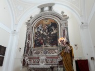 Das Portal ist ein Triumph der Dekorationen und Skulpturen, mit biblischen Themen: In der Lünette ist die Jungfrau mit Kind und zwei Engeln thronend dargestellt; im Architrav ist das Abendmahl dargestellt. Neugier: Die Wappen - Die drei Embleme stammen aus dem Jahr 1550. Der in der Mitte steht der Kaiser Karl V. von Habsburg; rechts der Dekan Vincenzo de Salazar und links der Vizekönig Pietro da Toledo. Diese Embleme wollten vom Dekan V. Salazar öffentlich demonstrieren, dass nur der Kaiser einen Dekan ernennen könne. §§§§