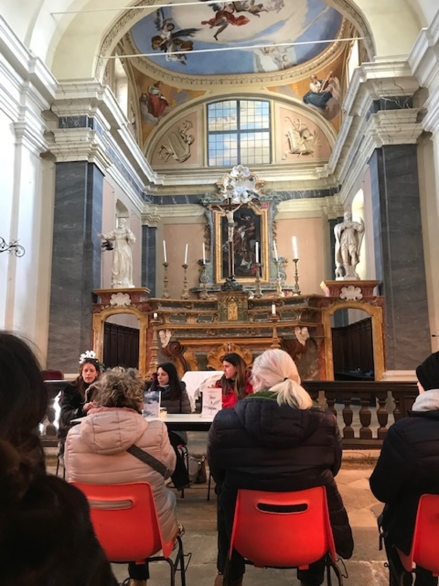 Die Künstlerinnen, Schriftstellerinnen, Produzentinnen und Kunsthandwerkerinnen präsentierten die Ergebnisse ihrer kreativen Arbeit auf dem kleinen Kirchplatz zwischen der Kapelle des Heiligen Kreuzes (Chiesa di Santa Croce) und der Kirche des Heiligen Genesius (Chiesa di S. Genesio). Neben verschiedenen weiteren Initiativen erwarteten die Besucher zum Beispiel Stände mit Kunsthandwerk aus der Region, Naturkosmetik, Malereien, Schmuck, Produkte aus Bienenwachs, kulinarische Köstlichkeiten und Bücher über Hexen. Es war ein herrlicher Tag voller Sonnenschein bei herbstlichen Temperaturen. Besucher, die sich zwischendurch aufwärmen wollten, fanden im Caffè Grande Ferroglio, das sich auf dem Platz befindet, ein gemütliches Plätzchen.