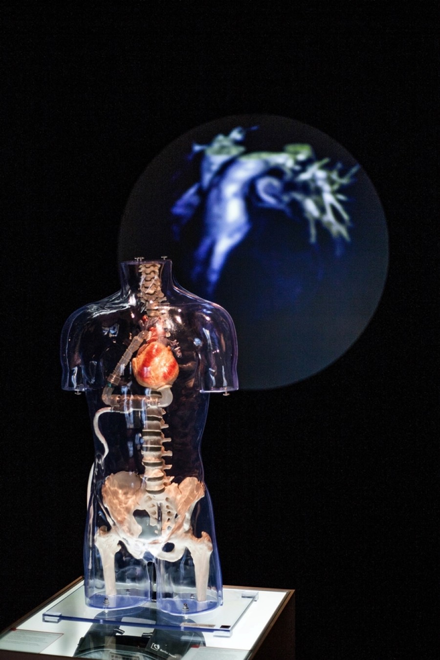 Empfangen wird man mit der dreidimensionalen Aufnahme eines schlagenden Herzens und den dazugehörigen dumpfen Herztönen. Diese Herztöne begleiten einen auch in den anderen Themenräumen der Ausstellung. Dem dumpf schlagenden Herz ist ein Plexiglastorso mit einem modernen Kunstherz gegenübergestellt. Moderne Medizin ist von Beginn an eine Symbiose von naturwissenschaftlichem Denken und dem Einsatz technischer Instrumente und Geräte. Medizinische Erfolge werden immer größer, führen aber auch zu gesellschaftlichen und ethischen Debatten. Übrigens erhielten seit 2002 mehr als 650 Menschen dieses Kunstherz und in einigen Fällen erholte sich das Herz der Patienten und eine Transplantation wurde hinfällig. Los geht der Rundgang dann in einem Anatomischen Theater, das einem frühzeitlichen medizinischen Hörsaal nachempfunden ist.