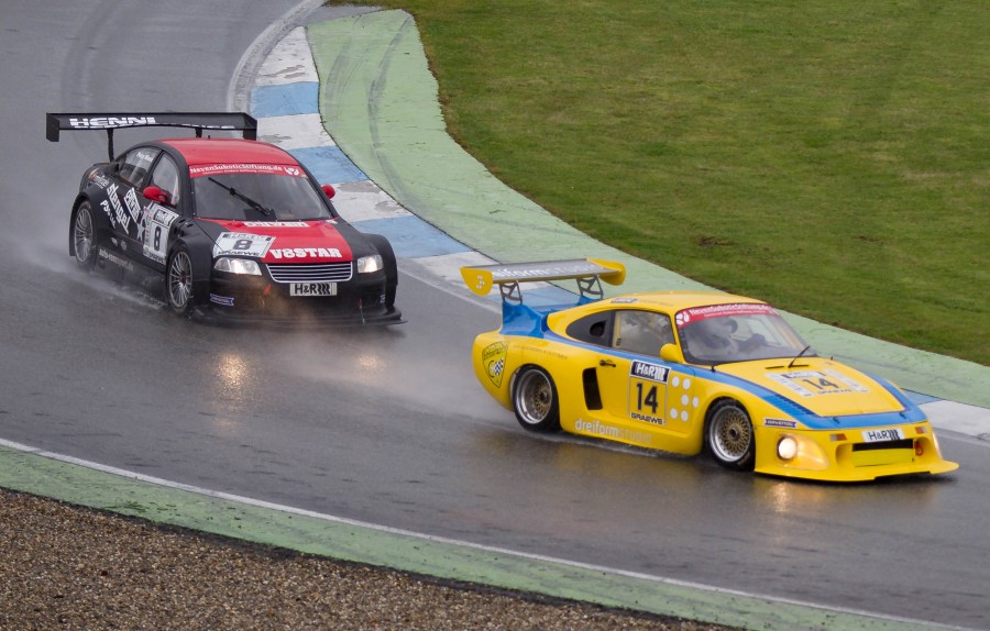 Mit dem Boss GP startete die wohl spektakulärste und auch schnellste Serie Europas. Für diese Rennserie sind nur große und PS-starke Formel 1-Boliden der letzten Jahre und Fahrzeuge der GP2-Rennserie zugelassen. Der Motoren-Sound und die Formschönheit der Bennetons, Toro Rossos und Dallaras lässt Erinnerungen wach werden. Ein ganzes Stück minimalistischer sind die Fahrzeuge der Historischen Formel Vau. Mit dieser Rennserie wurde die Vision „Rennsport für Jedermann“ in den 60-er Jahren realisiert. Formel Vau war zu seiner Zeit die größte Nachwuchsserie, die es je gab. Richtig nostalgisch wurde es als in die Jahre gekommene Triumph-Rennautos ihre Runden im Motodrom drehten. Und zumindest am Samstag bei strömendem Regen. Aber Motorrennsport ist eben kein Schönwettersport.