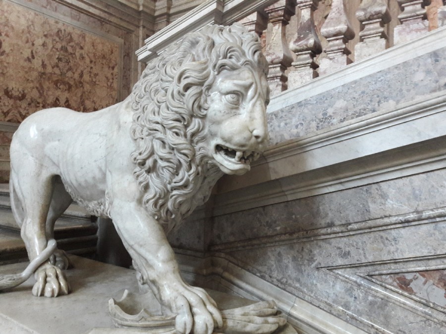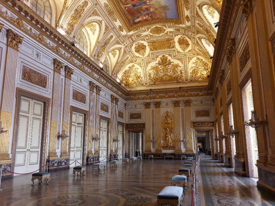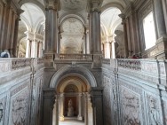 Wertvoll ist die große Treppe, die zu Vanvitellis höchstem Niveau führt: 116 Stufen, geschmückt mit zwei großen weißen Löwen aus Marmor, während drei Statuen an der gegenüberliegenden Wand stehen: Majestät, Verdienst, Wahrheit. Am Ende der Treppe führt zu den königlichen Wohnungen und der Cappella Palatina, die am meisten erinnernde Umgebung des Modells Versailles. Der drei Kilometer lange Park mit einer Fläche von 120 Hektar verfügt über zahlreiche Becken mit verschiedenen Fischarten und Fontänen wie der Margherita-Brunnen. Es hat eine Fläche von 47.000 Quadratmetern, fünf Etagen und vier Innenhöfe und 1790 Fenster.